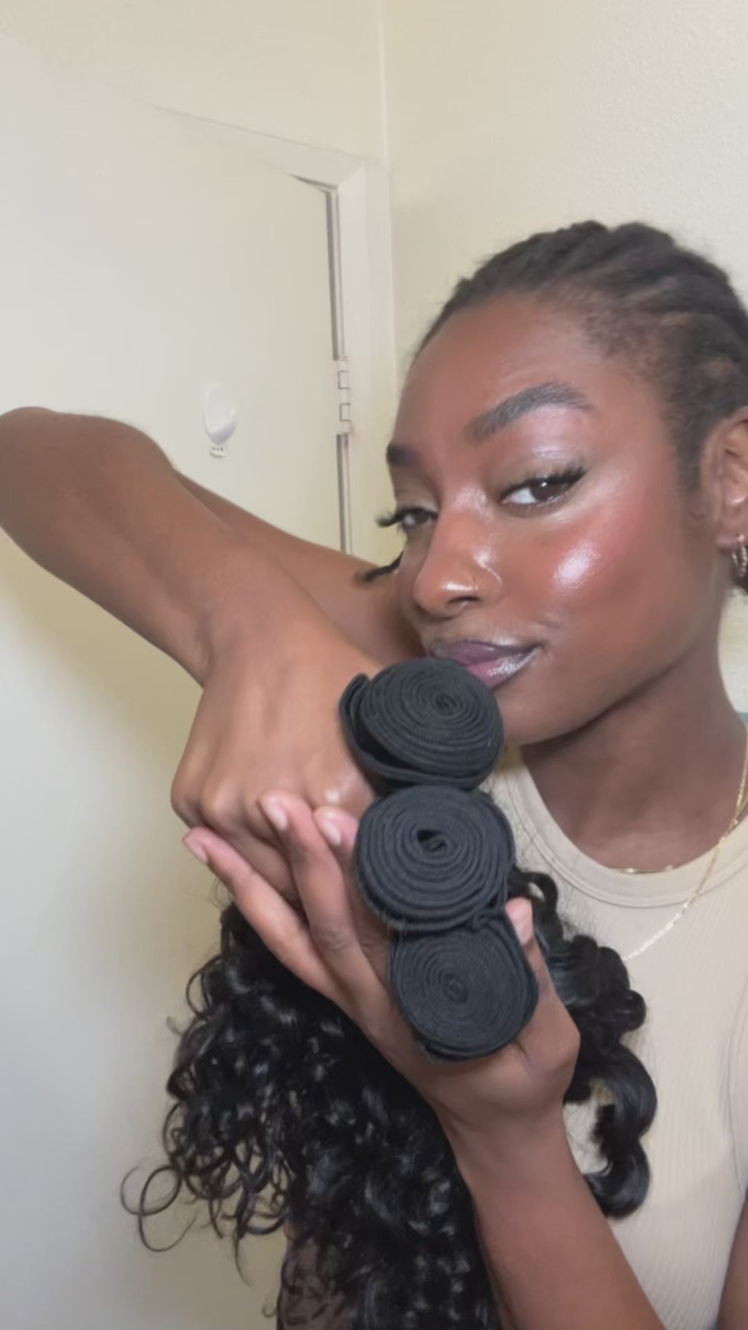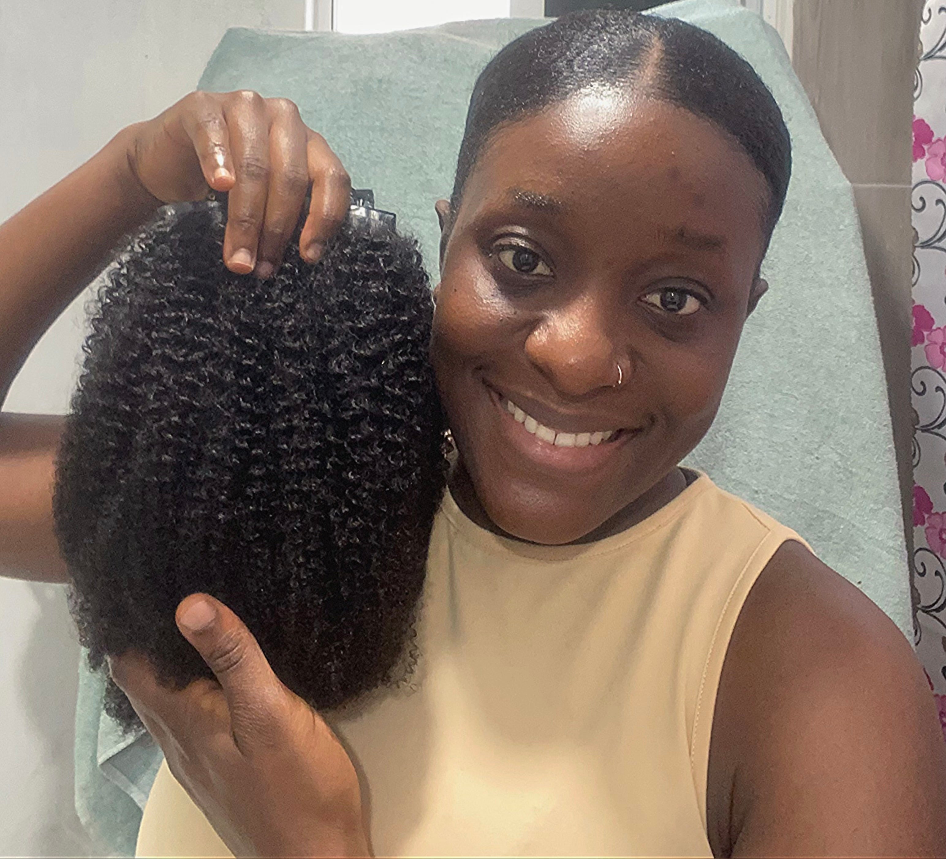 The hair is absolutely amazing!! No smell, only like 2 hairs shed which is normal and the curl pattern is so pretty!! Ahaha im so sad I cut the wefts now lol love love love!! 💕😍